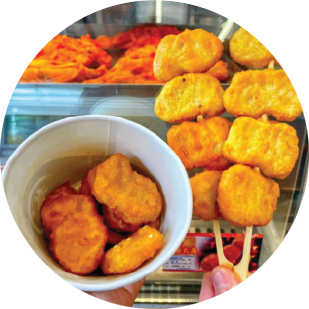 Textured peanut protein (peanut protein, soy protein, wheat protein), palm oil, breadcrumbs (wheat flour, water, yeast, salt, tartrazine, sunset yellow), corn oil, tempura powder (wheat flour, corn flour, starch, salt, disodium dihydrogen pyrophosphate, sodium hydrogen carbonate), starch, compound thickener (carrageenan, methyl cellulose, potassium chloride, konjac powder) compound seasoning (salt, monosodium glutamate, chili powder, black pepper, spices), flavor, spices, gellan gum